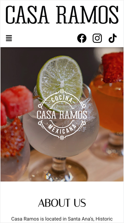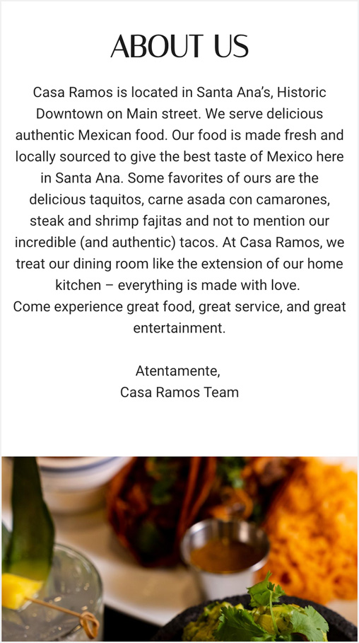 Casa Ramos is located in Santa Ana's historic downtown on Main street. They serve authentic Mexican food. The restaurant also holds events for people and companies to come and celebrate and they are well taken care of by the staff. The company wanted a website to show the incredible dishes and drinks that they have to offer and to let people know that they can host events.