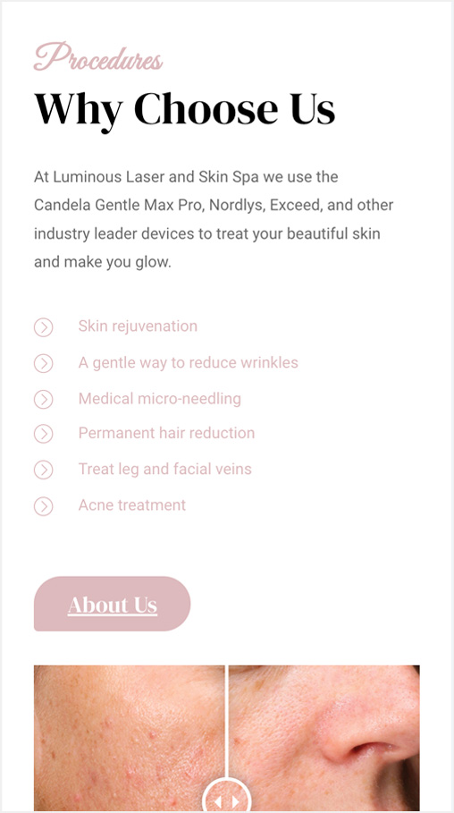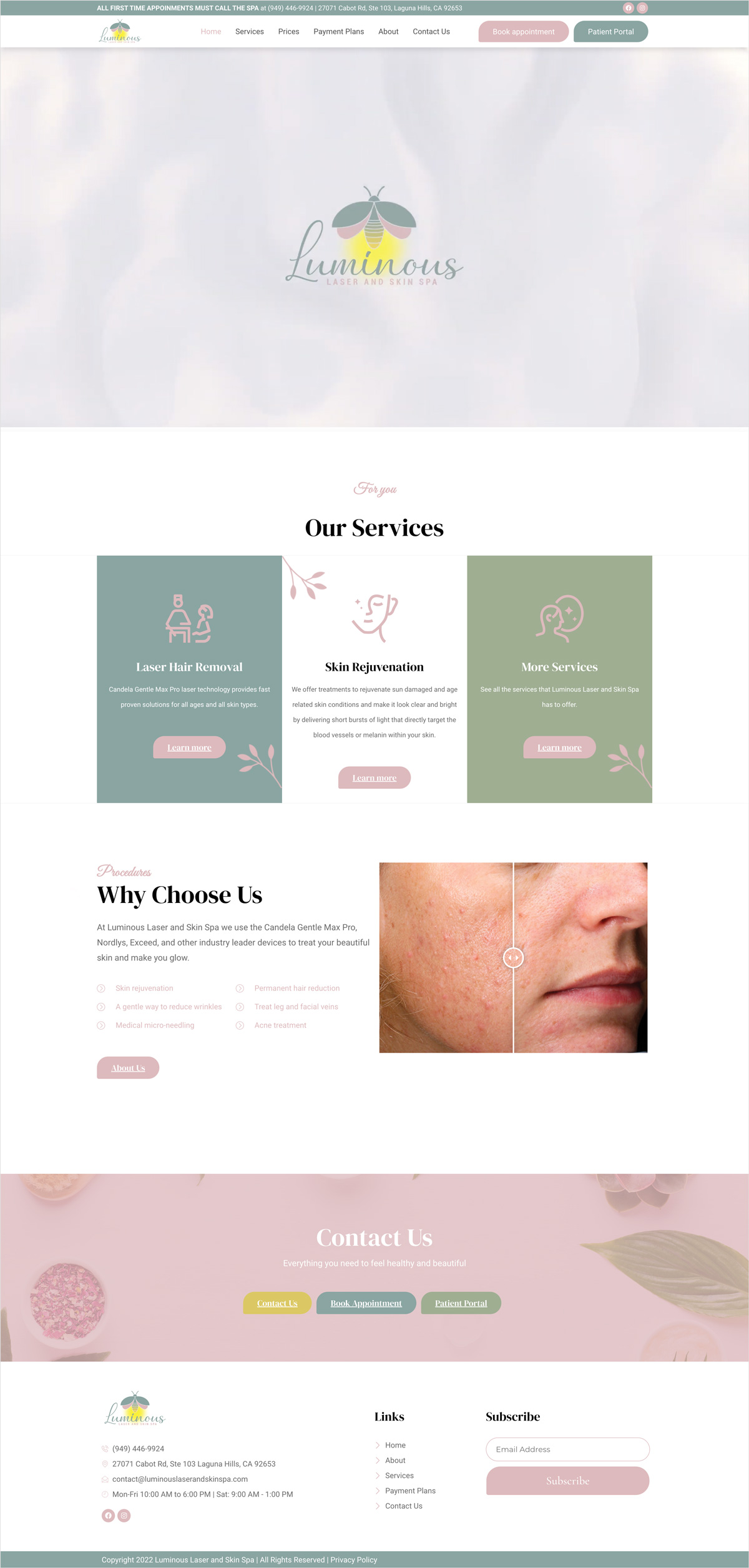 Luminous is a skin care and treatment facility located in Laguna Hills, California. Their mission is to provide safe, effective treatments for all of their clients, in a welcoming, all inclusive, and comfortable environment. They wanted a website to be able to show people what they have to offer with details about their services. They also wanted a way for new patients to get started with their company. Lastly, they wanted a website to offer a way where customers can book an appointment online.
